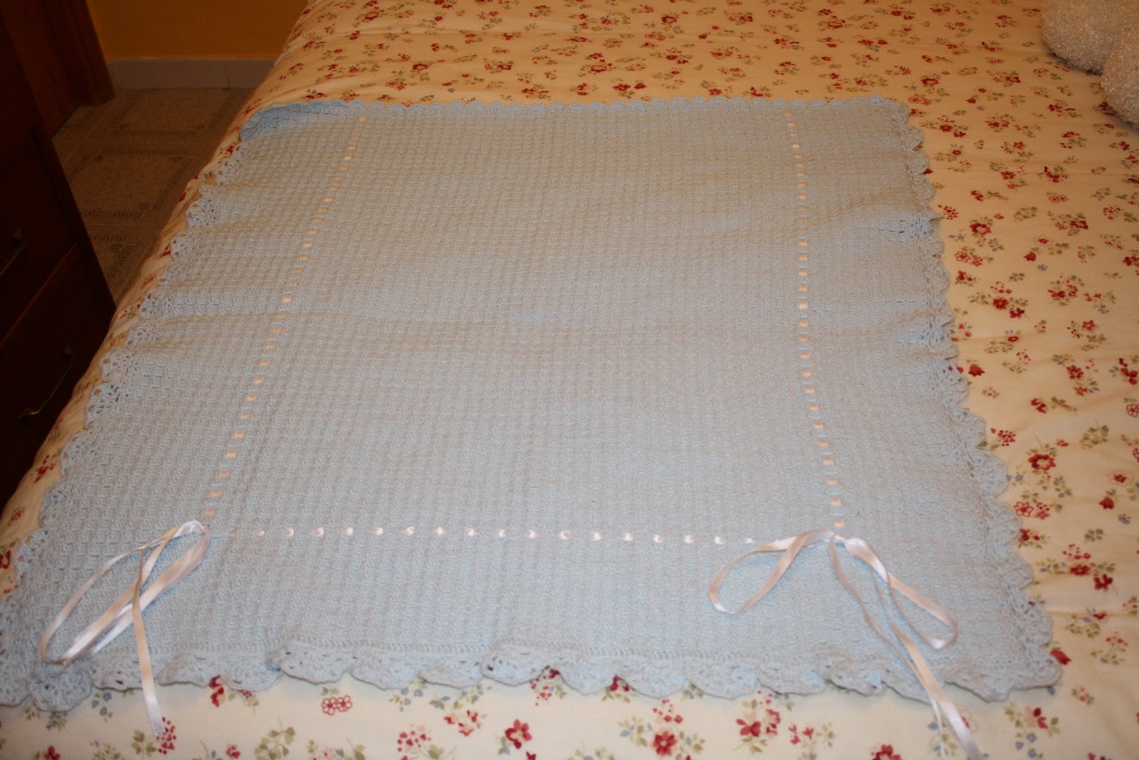 COLCHA AZUL CON LAZOS BLANCOS A CROCHET
