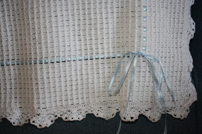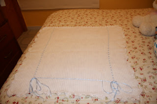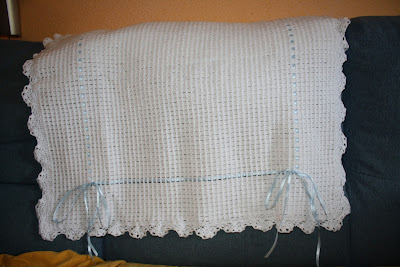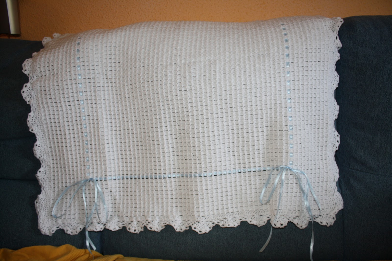 COLCHA BLANCA CON LAZOS AZULES A CROCHET