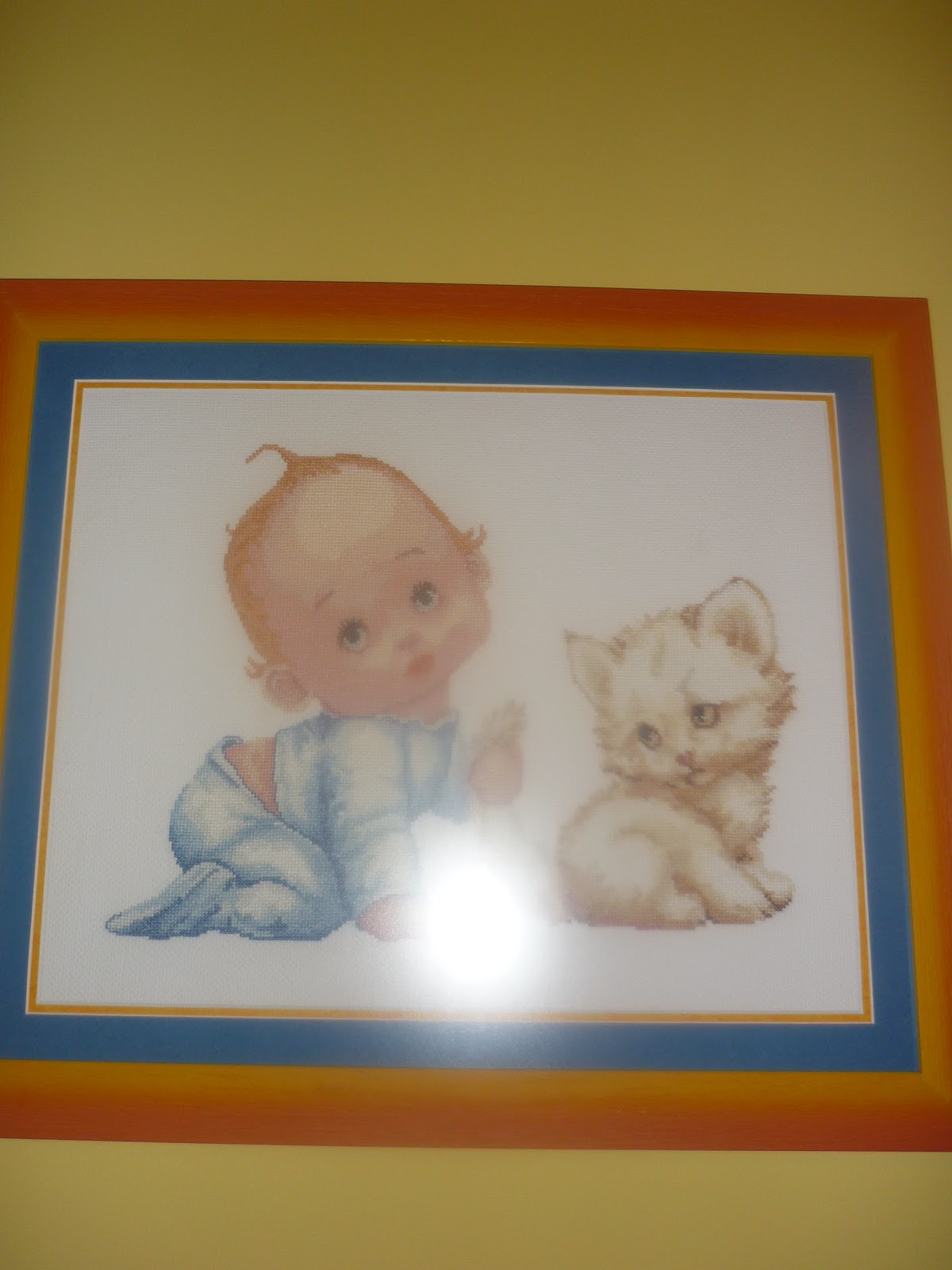 Así que también le damos al punto de cruz? Muy bonito el bebé gateando al lado del gatito. Es muy tierno. Es para Alba? Precioso para la habitacion de un pequeñajo.Felicidades y hasta pronto, guapa.